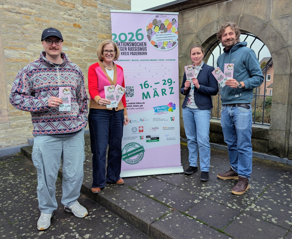 Das DemokratieBüro „Vielfalt lieben“ im Kreis Paderborn zusammen mit der ADA - Servicestelle Antidiskriminierungsarbeit im Caritasverband Paderborn e.V. organisieren erneut die Aktionswochen gegen Rassismus vom 16. bis 29. März 2026 im Kreis Paderborn: Patrik Brummer und Matthias Zimoch (ADA - Servicestelle Antidiskriminierungsarbeit im Caritasverband Paderborn e.V.), Kirsten John-Stucke (Museumsleiterin Kreismuseum Wewelsburg)  und Dina Peppmöller (DemokratieBüro Kreis Paderborn), v.l. ©Kreismuseum Wewelsburg, Gloria Bialas